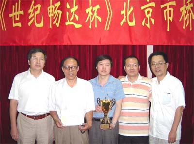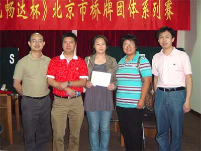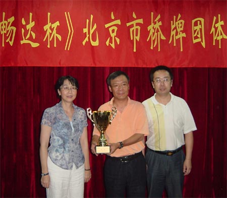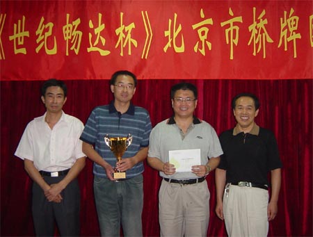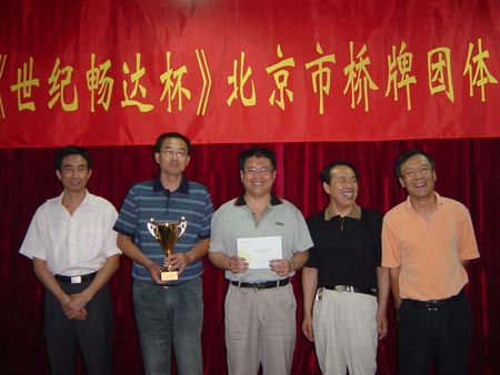 北京桥协领导向北京世纪畅达铁路设备技术公司董事长吕冬先生颁发纪念奖杯 吕冬先生为获得“世纪畅达杯”北京市桥牌团体系列赛亚军的杨月新队颁奖 冠军 世纪畅达队(队员有:吕冬 王艳鸿 余明泉 毕书广 侯勖 黄艳) 亚军 杨月新队(队员有:杨月新 张志强 刘兆林 王隆 胡迪 姜宁 ) 第三名 育新队(队员有:李慧林 周祖发 朱允伦 苏驷希 刘琳 陈坚 )