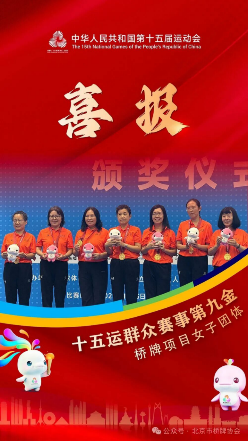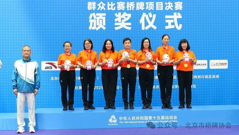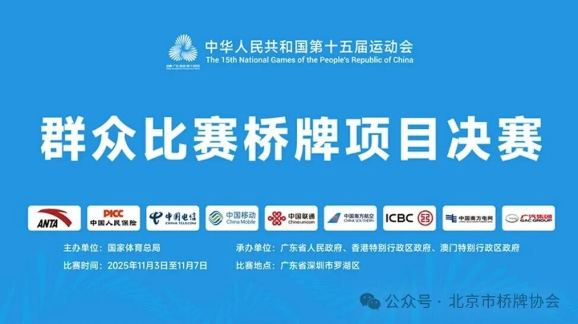 由国家体育总局主办、广东省人民政府、香港特别行政区政府、澳门特别行政区政府承办的第十五届全运会群众比赛桥牌项目决赛于11月7日在广东深圳落下帷幕,北京桥牌代表团发挥出色,获得一金一银一铜的优异成绩。